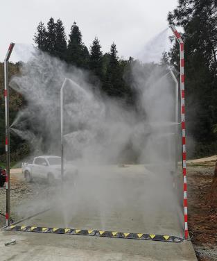 This is a small disinfection system that can output 10~15 bar of pressure and can install up to 10 nozzles. This system is composed of pumps, mist nozzles, plastic pipes, connectors, pressure regulators, infrared sensors, time relays and other components. The system senses the passage of personnel through infrared sensors, turns on the system to work; you can set the working time in second, minute, and hour after shutdown.